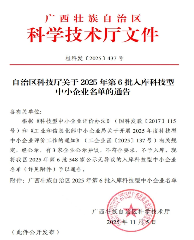 近日,广西壮族自治区科技厅正式公布 2025 年第六批入库科技型中小企业名单,兴业海螺环保科技有限责任公司凭借扎实的技术创新实力与突出的行业贡献,成功跻身榜单,标志着公司在环保科技领域的发展获得官方权威认可。